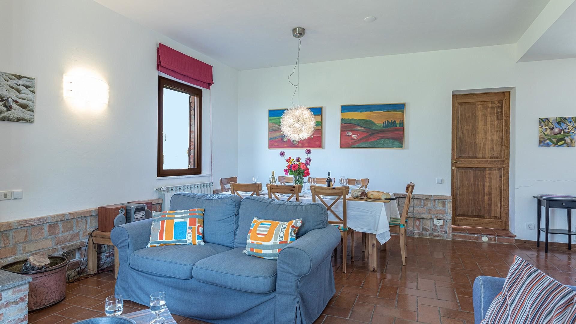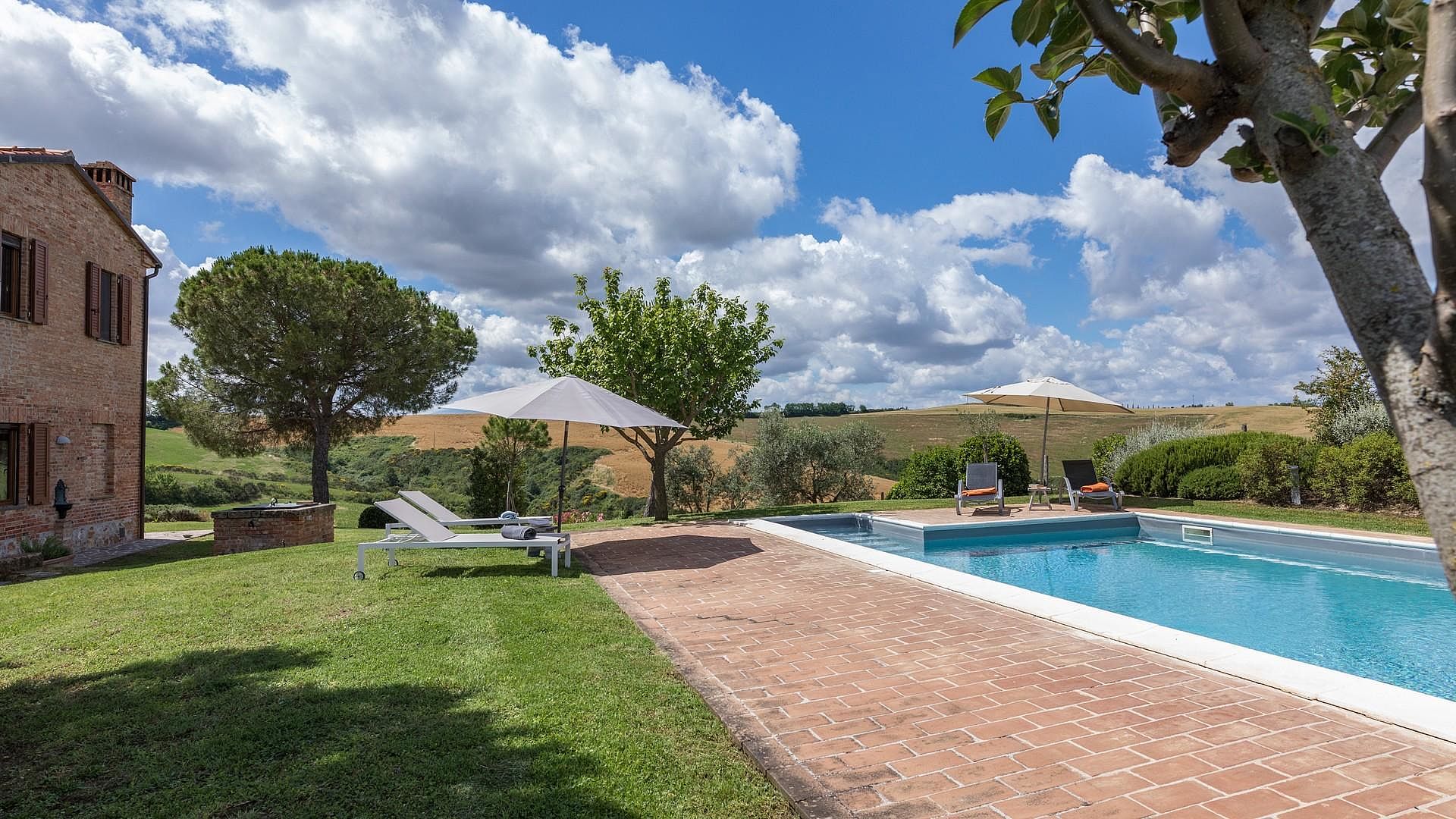 Dieses kleine ehemalige Bauernhaus liegt inmitten einer typisch toskanischen Landschaft in der Nähe des kleinen Dorfes Montisi, eine Autostunde von Florenz und 45 Minuten von Siena und Perugia entfernt. Das Grundstück ist etwa 2500 Quadratmeter groß und liegt auf einer kleinen Anhöhe, von der aus man ein wunderschönes Panorama genießen kann. An klaren Tagen kann man sogar den Monte Amiata sehen. Das Haus ist 160 Quadratmeter groß, erstreckt sich über zwei Etagen und kann bis zu neun Personen beherbergen. Im Erdgeschoss befinden sich der Wohn- und Essbereich, ein Schlafzimmer und ein Badezimmer. Im ersten Stock befinden sich noch drei weitere Schlafzimmer und 2 Badezimmer. Das Haus ist von einem großen Garten mit einem schönen Swimmingpool umgeben.