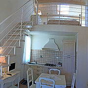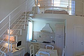 EG: Wohnraum mit Küchenzeile und Esszimmer, Schlafsofa auf Galerie, 1 Doppelschlafzimmer, 1 Badezimmer mit Dusche, eigene Veranda mit Poolblick