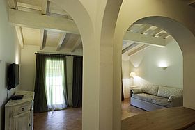 Zum Anwesen gehört ebenfalls ein angeschlossener landwirtschaftlicher Betrieb der Wein- und Olivenölproduktion. Mehrere komfortable Ferienwohnungen unterschiedlicher Größe stehen den Gästen zur Auswahl. Die Einrichtung ist hochwertig und geschmackvoll. Alle Ferienwohnungen verfügen über einen separaten Eingang sowie eine eigene Terrasse oder Balkon mit Blick auf einen der beiden Naturseen des Anwesens. Ein entspanntes Bad lässt sich am sehr schön angelegten Swimmingpool mit Natursteinterrasse genießen.